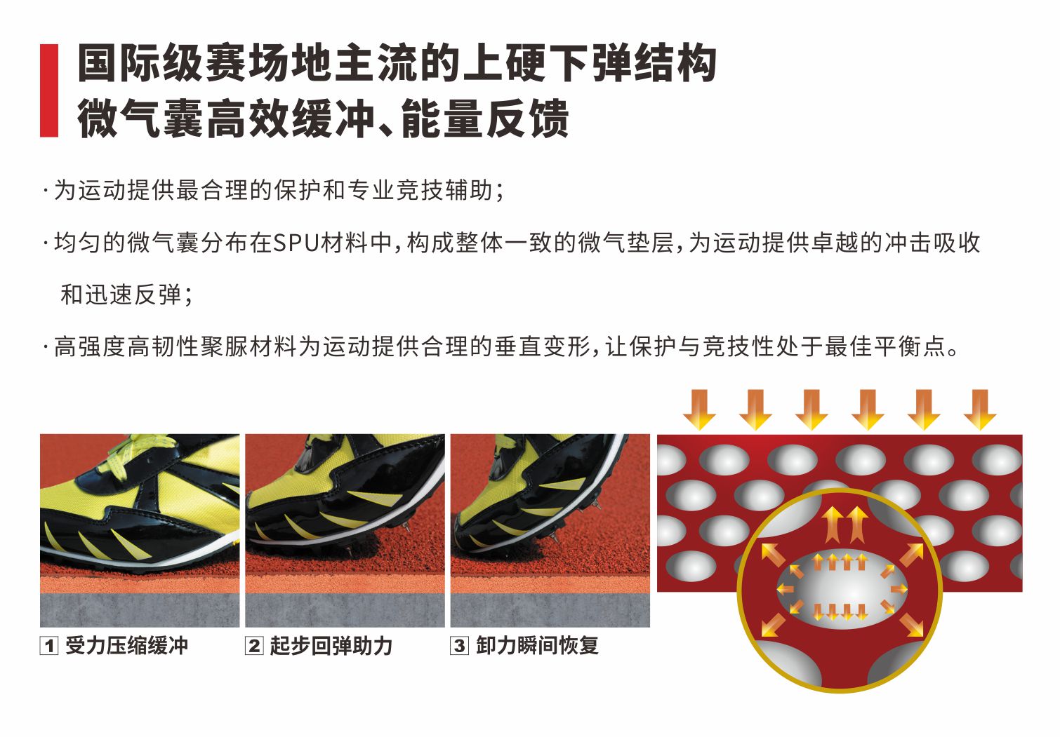 无味无毒—长河集团从原材料开始执行的环保安全定位,让运动回归追求健康的最初出发点。独有的微气囊缓冲反弹结构技术为运动带来最佳的缓冲保护,创新的SPU聚脲改性材料为场地使用带来高强高韧性,保证了垂直变形量,使场地时刻保持专业运动竞技状态。