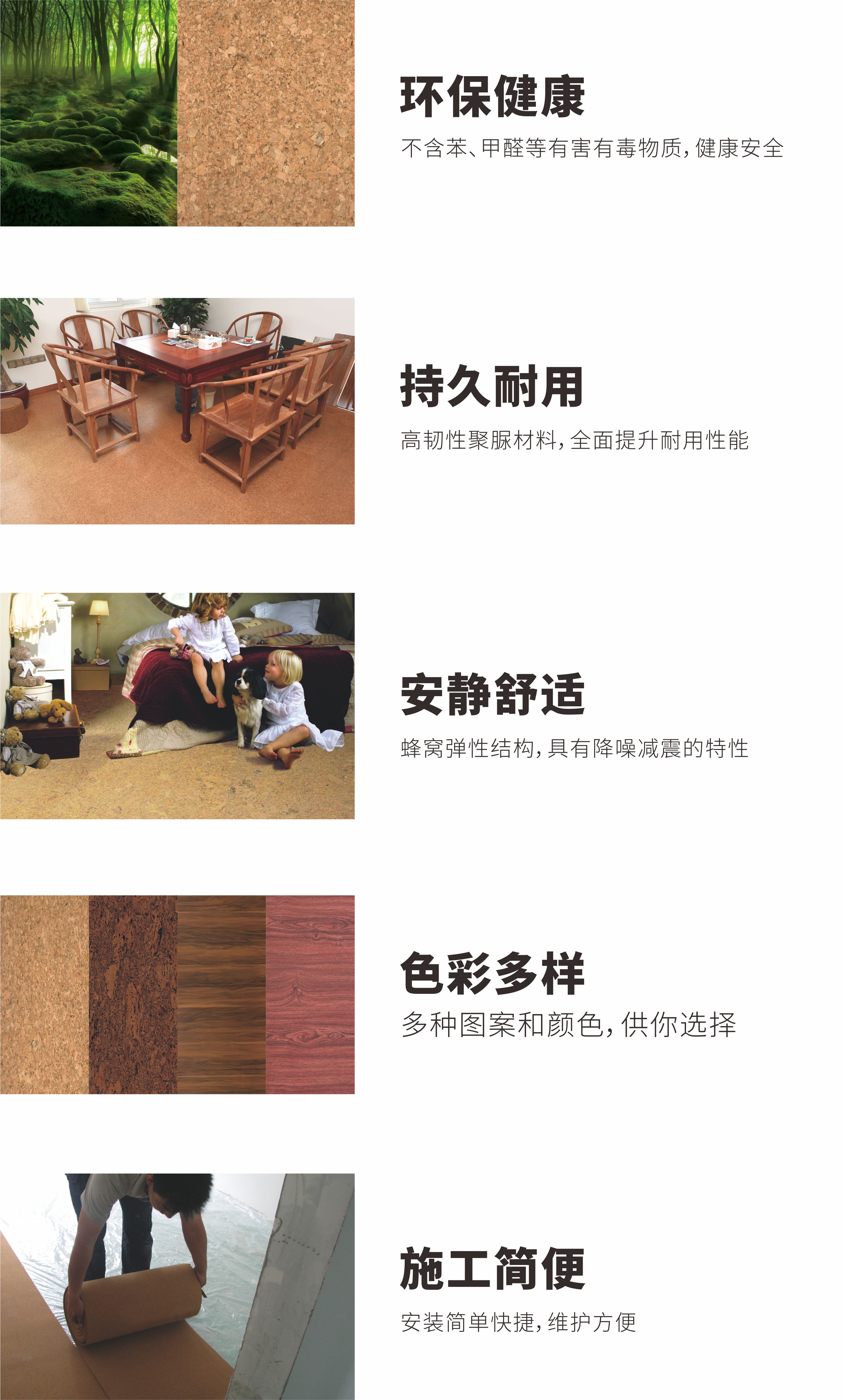 采用可再生橡木树皮压制而成(即红酒瓶塞材料)。经天然橡树树皮制作出来的软木地板,无毒无味,无甲醛等化学用品,大量呈蜂窝状排列的软木细胞构成的结构使得它具有质软、伸缩性强的特性,柔韧抗压的效果,可以显著地减少人在行走过程中各部位承受的压力,柔软、安静、舒适;软木特殊的材质使得它即使在潮湿的环境里,也不怕虫蛀,特殊表面处理使得它不会藏污纳垢和滋生细菌,防虫、防霉、防腐,给孩子健康呵护。