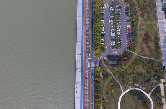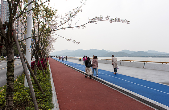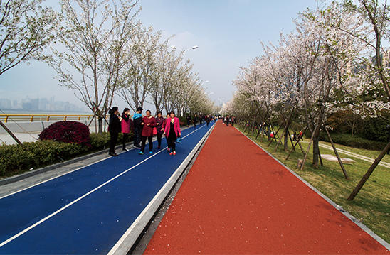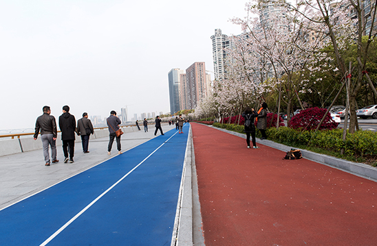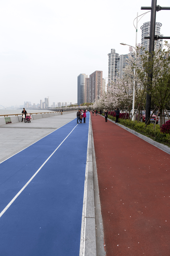 改造提升后,如今的闻涛路从原来一条交通繁忙的沿江“路”,华丽转身变成了一条集散步、跑步、骑行、车行为一体的多功能综合性道路,成为集健身、交流、休闲等功能为一体的沿江慢生活带和独特景观带。其中,可以边跑步、边看江景的蓝色塑胶跑道被不少跑友和市民称为“最美跑道”。