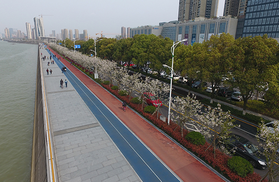 闻涛路是杭州市三江两岸和高新区(滨江)沿江景观带的重要组成部分,“十里樱花最美跑道”就位于闻涛路。作为滨江扮靓江(河)岸线、还江于民的重要项目之一,2015年11月起,东起奥体博览城七甲河,西至东信大道,全长近16公里的闻涛路进行了道路改造提升。