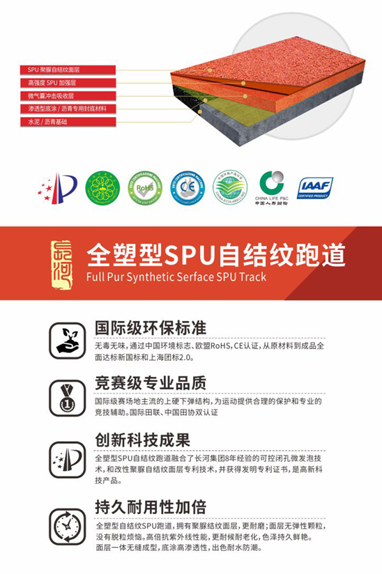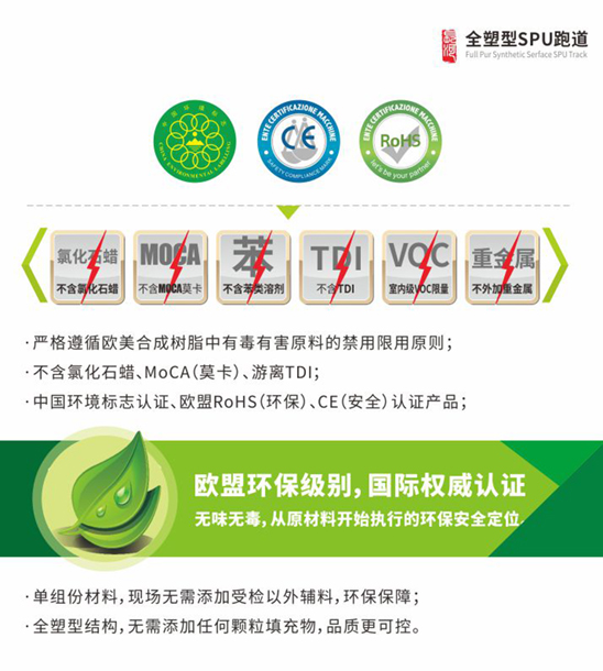 长河”全塑型SPU跑道“材料采用高度责任性环保配方,纯胶结构,不掺加任何黑胶粒等填充物杂质,可在沥青基础或水泥基础上施工。通过国际级专业权威机构复式认证,不含氯化石蜡,不含MOCA摩卡,不含苯类溶剂,打造真正环保安全跑道。