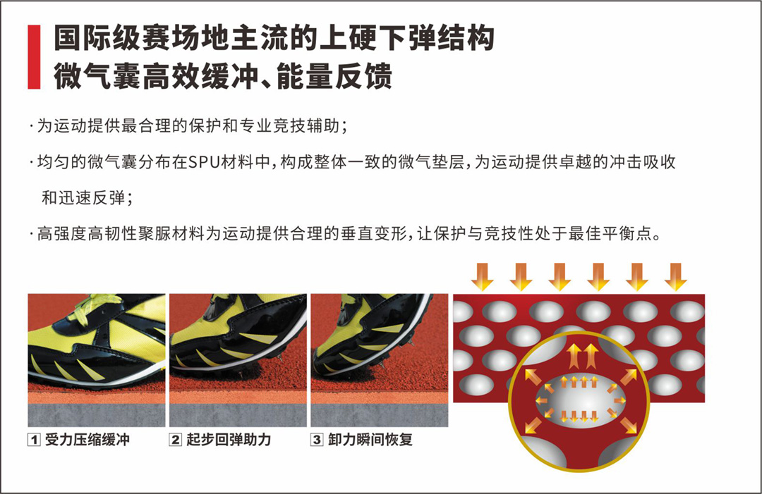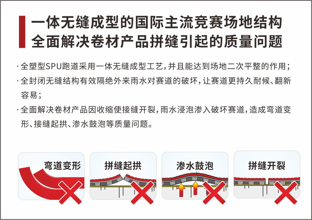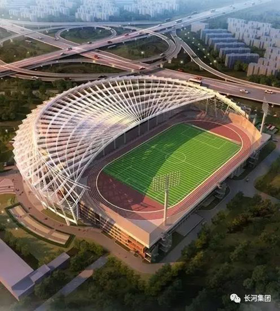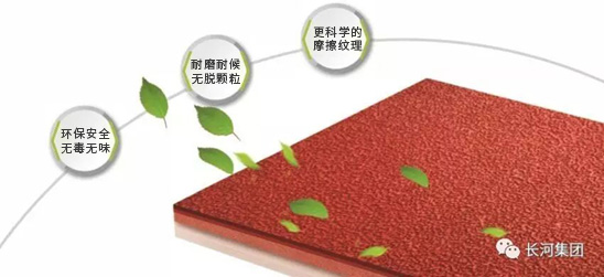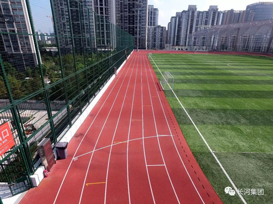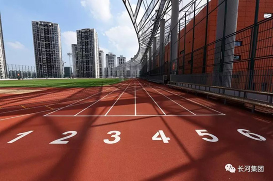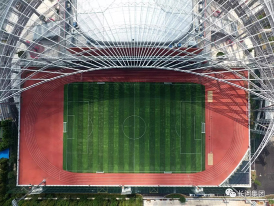 从空中俯瞰,屋顶上一大片绿荫的足球场与色泽艳丽的跑道交相辉映,这是一片长河全塑型SPU自结纹跑道,它独特的微气囊高效缓冲反弹结构为运动提供最佳的冲击吸收和迅速的反弹,使运动员得到了合理的保护和专业竞技辅助;此外,这是一款最高环保级别的橡胶跑道,是国际田联认证产品,环保安全、无毒无味,不管是成人还是小孩都能放心使用;而且它有最佳的耐用性能,耐水耐候,无脱颗粒。我们相信,新体育场开放运营后,一定能为居民提供首屈一指的锻炼体验。