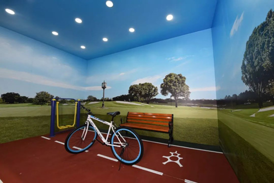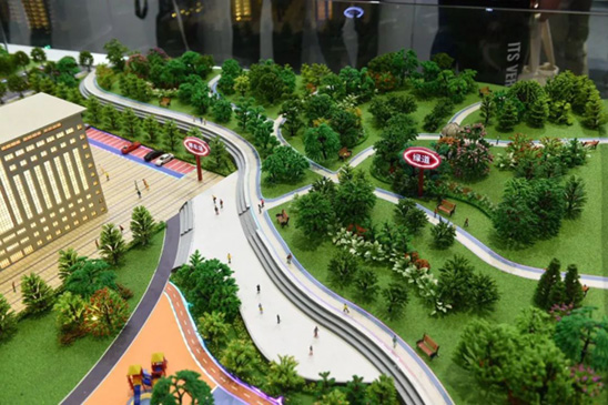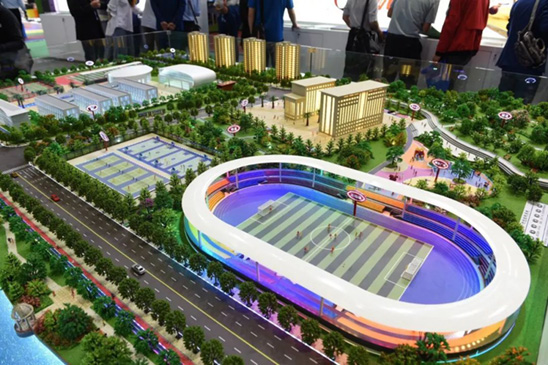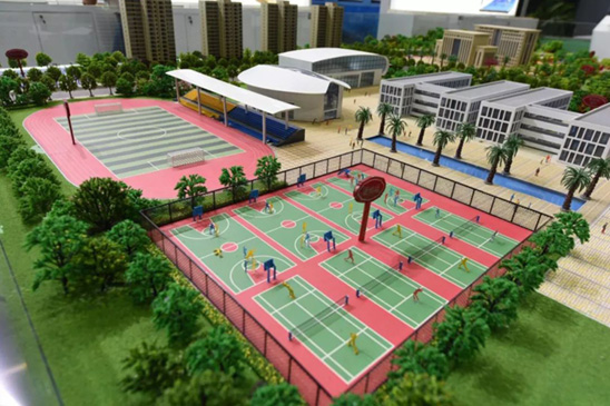 在产品展示区中,最瞩目的非展示模型莫属。这个沙盘涵盖了校园和体育公园两大系统,直观展示出各款产品的适用范围,让客户对产品应用更清晰。
