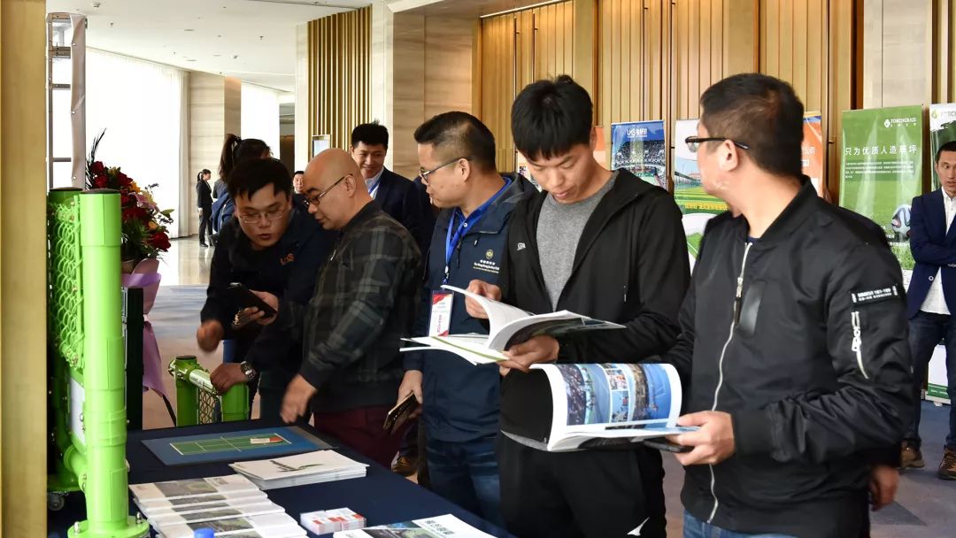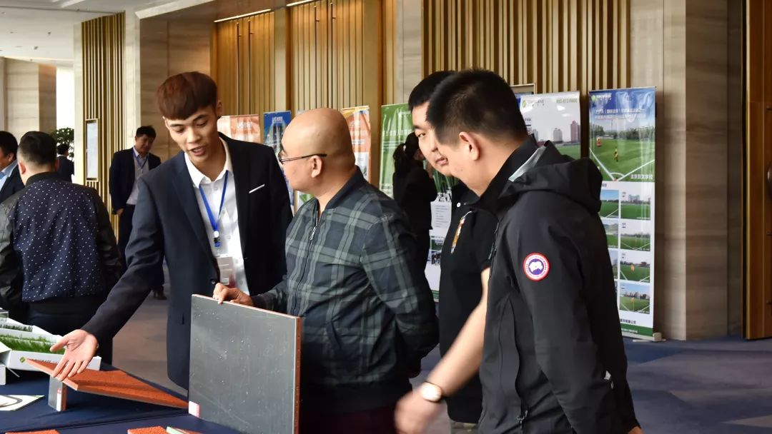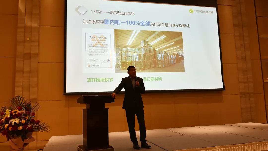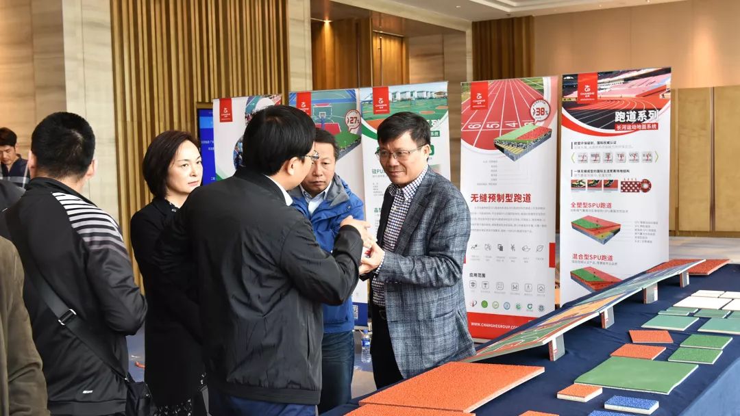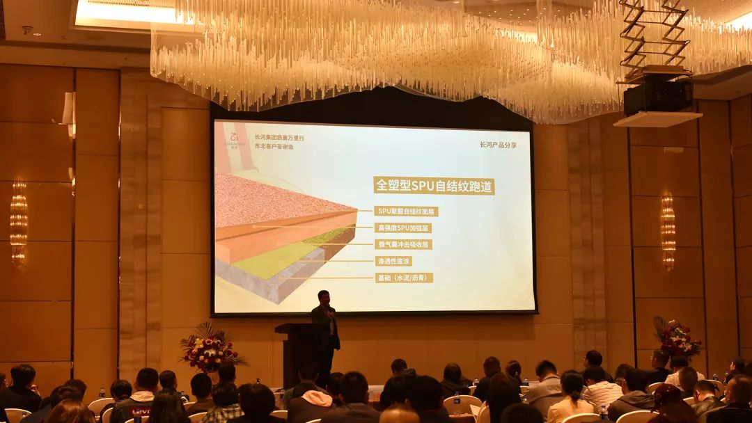 长河集团董事长赵文海先生上台,向现场人员介绍了满足新国标对物理、化学性质要求的全塑型SPU自结纹跑道、硅PU球场(无溶剂)、ESPU球场(无溶剂)、ESPU跑道(无溶剂)等长河系列产品,受到了与会人员的热议和喜爱。