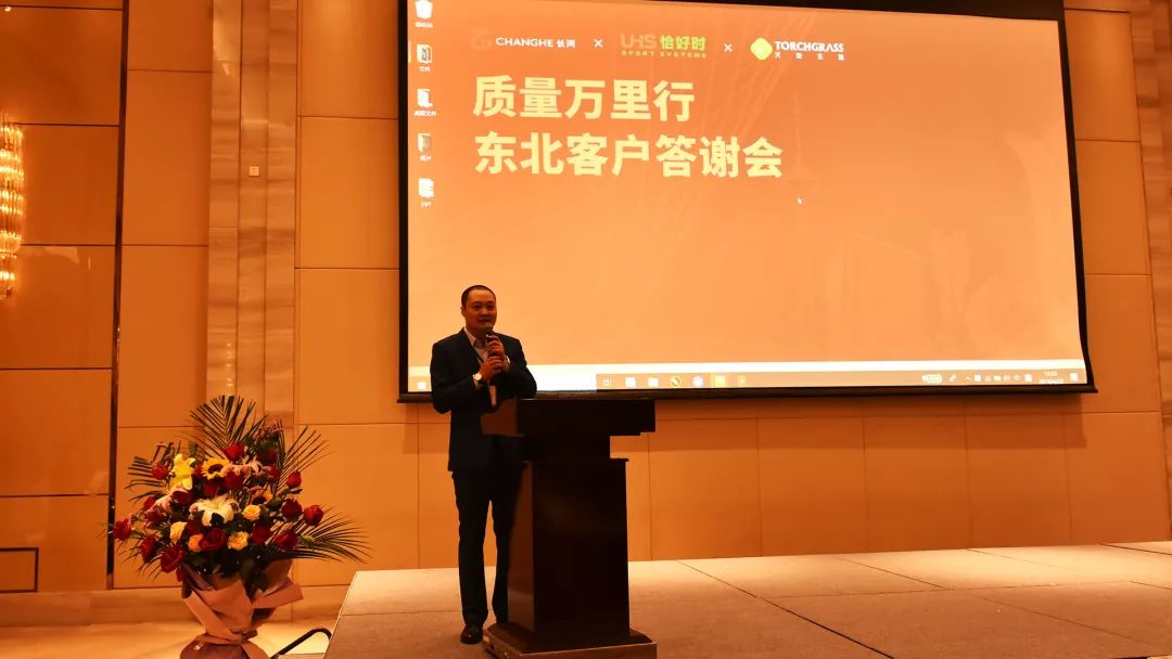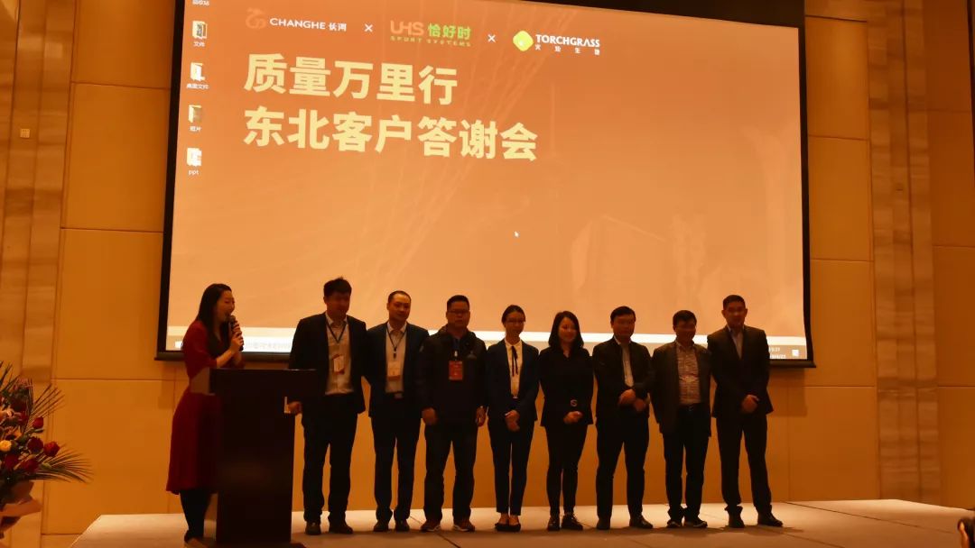 2019年4月22日,长河集团质量万里行东北客户答谢会在沈阳市世贸希尔顿国际酒店举行,本次会议由江门长河集团、北京火炬、广东恰好时联合举办。长河集团董事长赵文海先生、北京火炬生地董事长杨毅良先生、广东恰好时体育总经理常晶晶女士、中国建材检验认证院副院长郭中宝及众多东北区合作伙伴共同出席了会议。